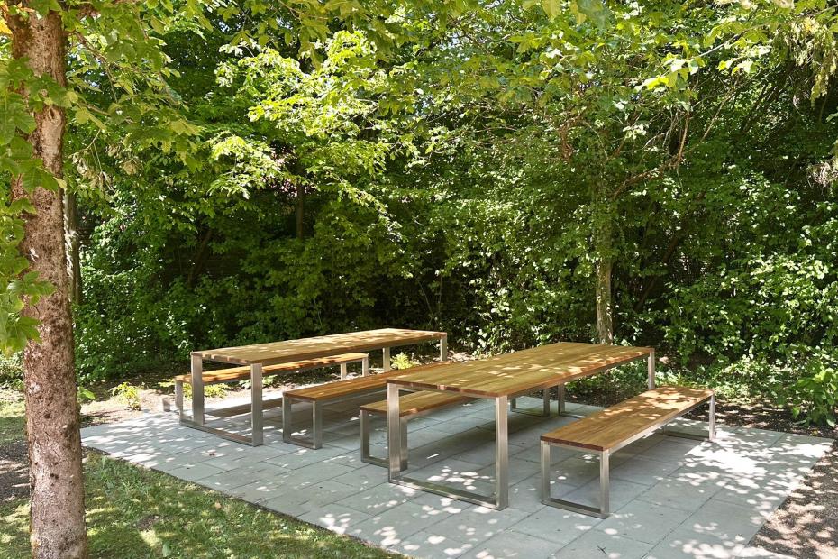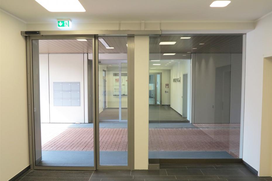 Neugestaltete Eingangsbereiche mit Schiebetüren, Innenhof mit Sitzbänken